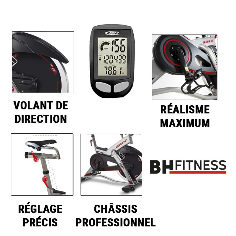 L’offre AVEC CONSOLE ajoute un compteur avec écran LCD utilisé dans les cours collectifs de biking dans les salles de sport, avec capteur de fréquence cardiaque, distance, watts, calories, RPM.