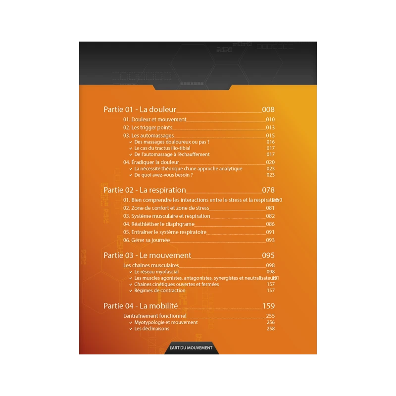Dans l’Art du Mouvement, Aurélien BROUSSAL-DERVAL s’attache à poser les bases de l’entraînement avant l’entraînement lui-même, et propose au-delà d’une méthode d’entrainement traditionnelle, un véritable manuel d’utilisation et d’entretien du corps humain.
