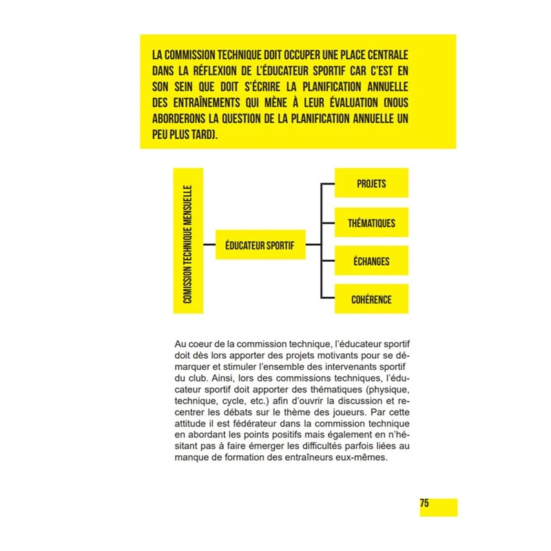Ce livre, unique en son genre, s’adresse aux éducateurs sportifs mais également aux présidents et dirigeants des associations sportives qui ont parfois du mal à cerner et définir la mission de leurs éducateurs sportifs. Dans un milieu extrêmement varié et diversifié les auteurs proposent, à partir d’un vécu et d’une longue expérience, des propositions et des pistes de réflexions pour les éducateurs sportifs exerçant leur profession dans des clubs sportifs dont les équipes évoluent dans les niveaux départementaux et régionaux. L’éducateur sportif doit fédérer autour d’un projet clairement défini qui va permettre aux jeunes adhérents, dans l’association, de donner du sens à leur pratique sportive. Se centrer sur l’individu est primordial et les auteurs démontrent que la fonction première du projet collectif doit être centrée sur l’individu celui-ci étant au service du groupe. La fonction de l’éducateur sportif est particulièrement importante car c’est lui qui va aider à donner une vraie identité au club. En mixant sa capacité d’écoute et son rôle d’intervenant indispensable et incontournable, l’éducateur sportif est le garant des décisions prises par les dirigeants. Un autre aspect important de la réflexion centrée sur l’individu est la capacité permanente pour l’éducateur sportif d’évaluer. Cette évaluation se doit d’être très individualisée avec la mise en place d’outils d’évaluation précis car le but, pour chaque joueur, est de se réaliser. L’idée de progrès doit être maintenue sans forcément aller vers le haut niveau mais pour se donner du plaisir et pour que l’individu ait le sentiment d’évoluer dans le bon sens. Le métier d’éducateur sportif dans les prochaines années devra muter d’un statut d’entraineur vers un métier plus en adéquation avec l’organisation générale d’une structure. L’éducateur sportif se devra d’être force de projet et de proposition pour fédérer, former, organiser et planifier au sein de son association. De plus, l’éducateur sportif devra être en capacité de travailler en permanence avec les autres structures sportives de sa discipline et les autres disciplines de son environnement immédiat. Sommaire : Partie 1: Définir un projet collectif Partie 2 : Le rôle de l’éducateur sportif au sein du club Partie 3: La commission technique Partie 4 La planification annuelle Partie 5 : Les entraînements Parties 6 : Quelles évaluations ? Partie 7 : Quel avenir pour le métier d’éducateur sportif
