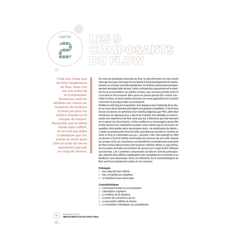 – dans la première, l’ouvrage s’intéresse au flow de manière générale (historique, composants, intérêt pour la performance sportive) ;